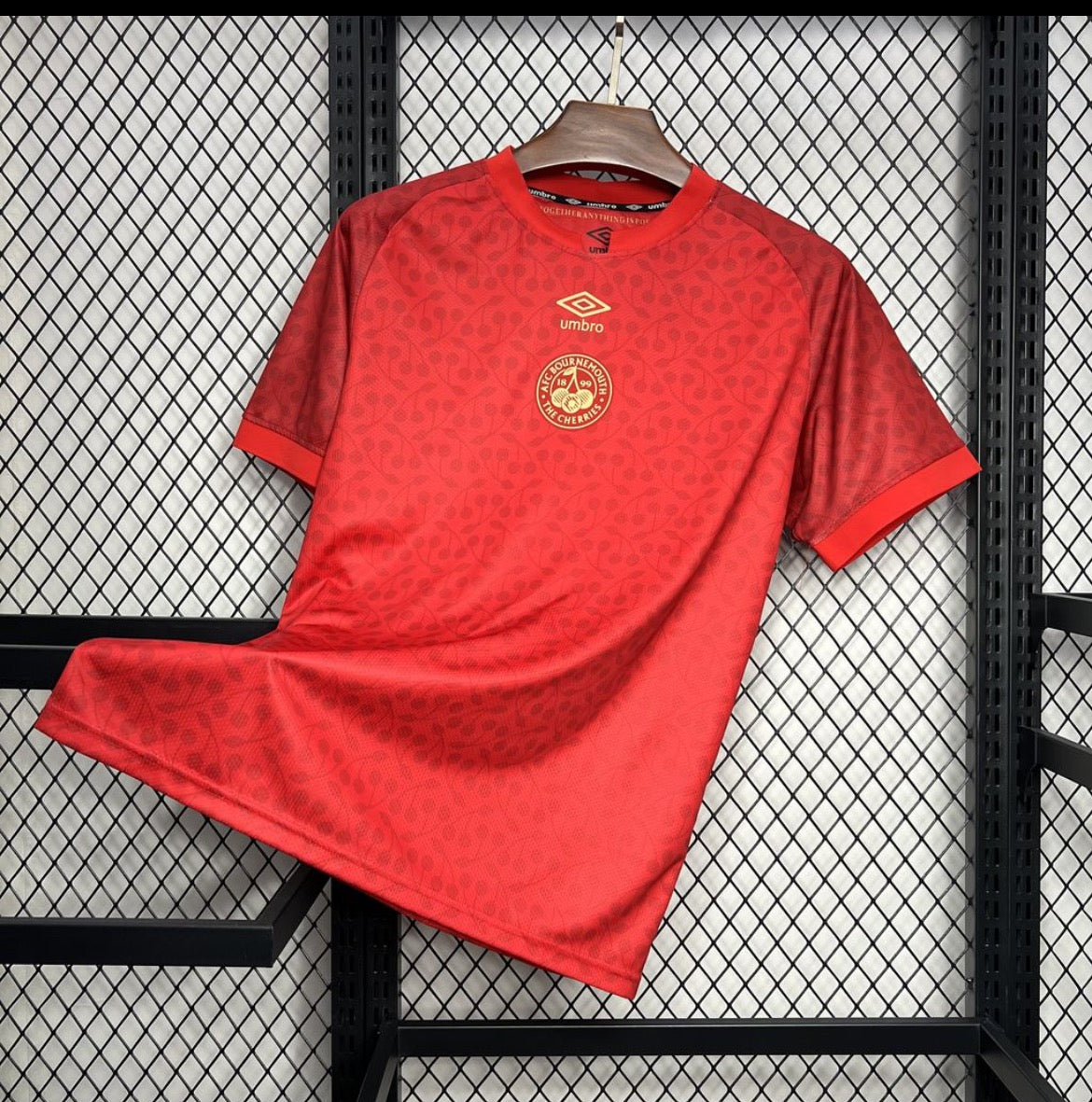 ✅ Seizoen 24/25 design – Dieprood shirt met een subtiel patroon verwerkt in de stof, goudkleurige details en het Bournemouth-clublogo centraal op de borst. Chic en sportief tegelijk.