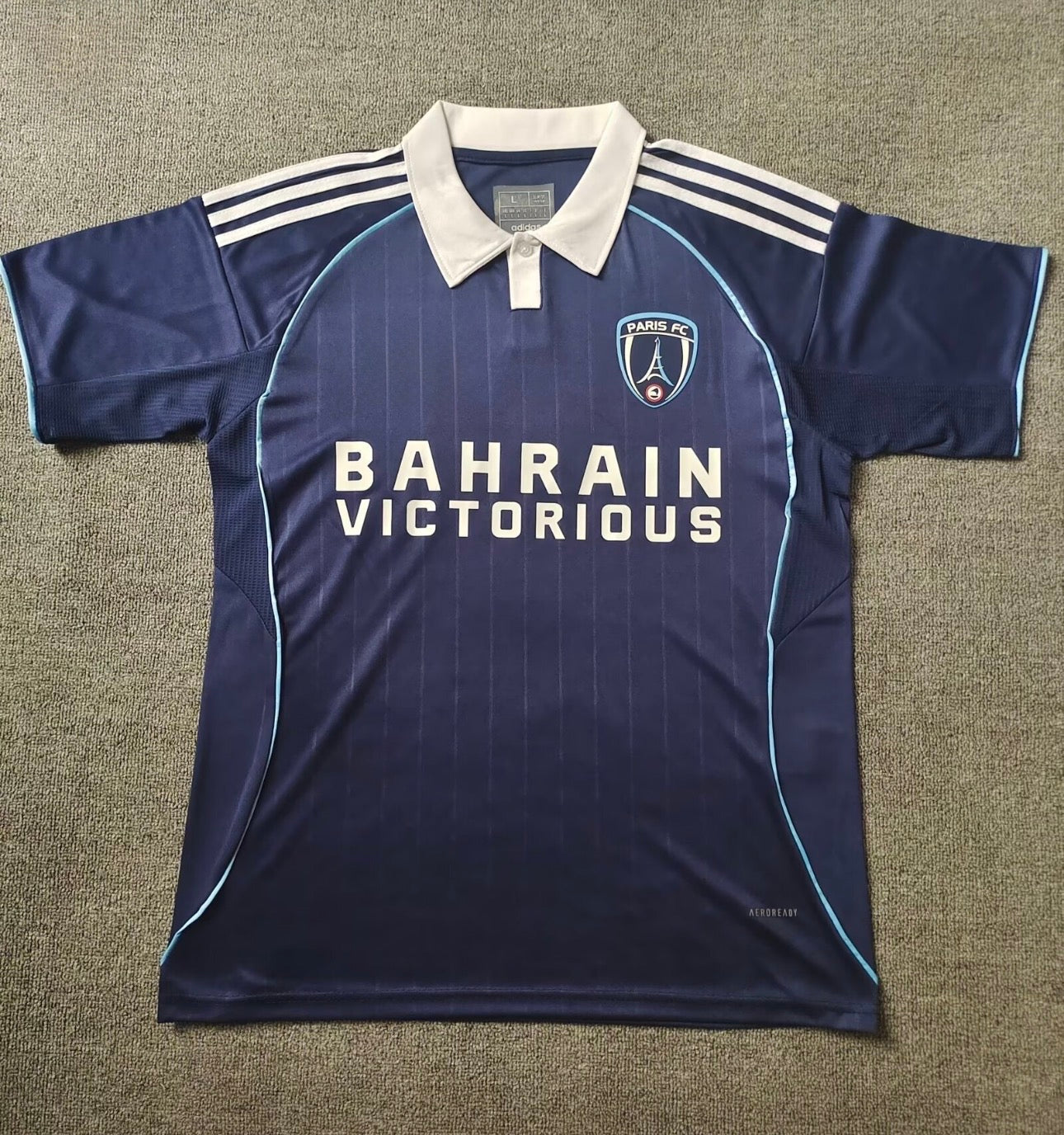 Het Paris FC Thuisshirt 25/26 combineert de rijke historie van de club met een strak, modern design. De diepe navy-blauwe basis, subtiele sky-blauwe accenten en de fijne verticale pinstripes geven een elegante uitstraling — stijlvol én representatief voor de clubidentiteit.